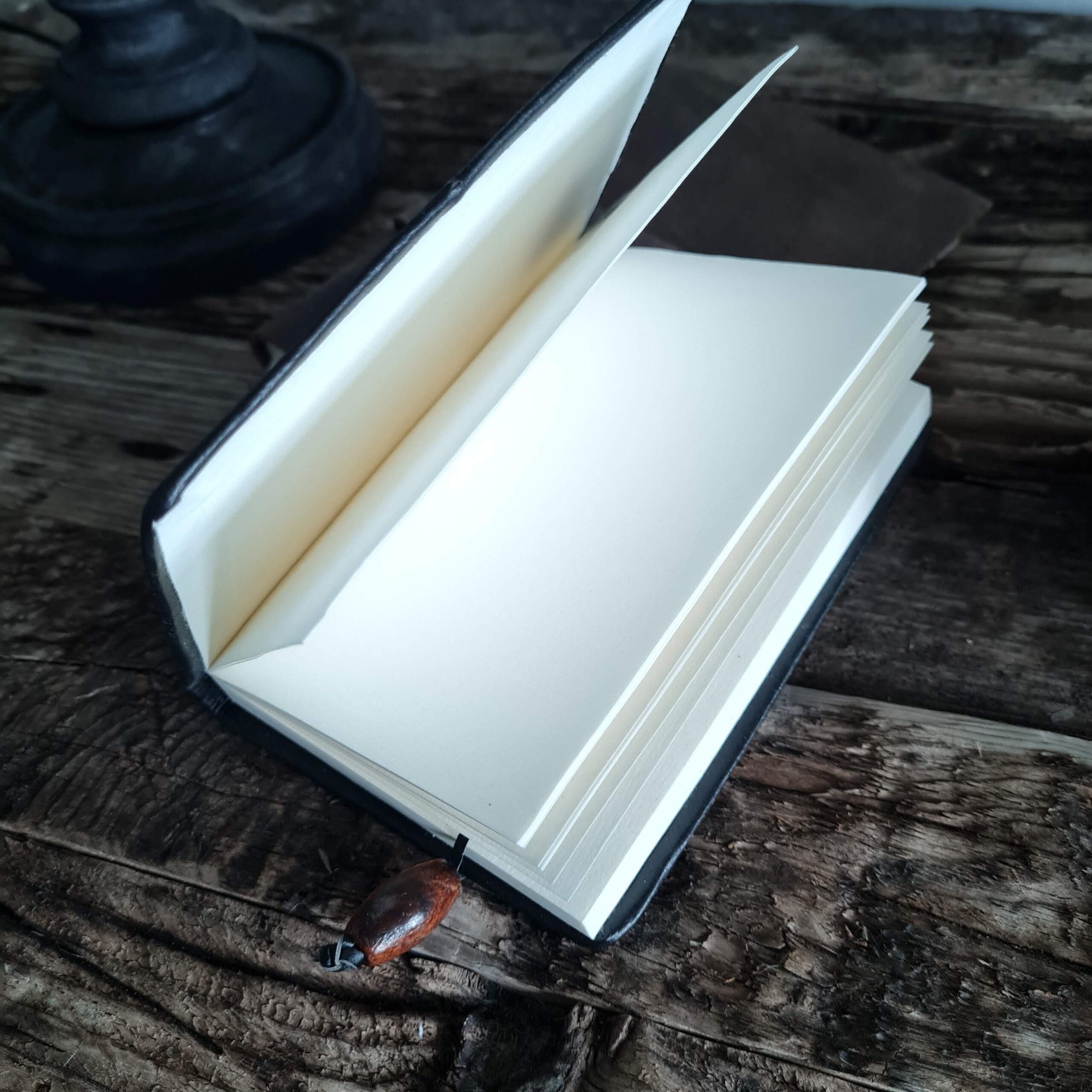 Prachtig zwart lederen notitieboekje handgemaakt uit India. Het boekje heeft een leren touwtje met een bruine kraal die je kunt gebruiken als bladwijzer.